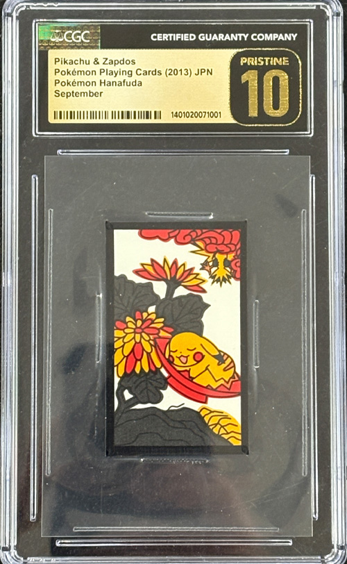 Graded Pristine 10 by CGC (Certified Guaranty Company), this card represents near-perfect condition and ranks among the highest-quality Pokémon Hanafuda cards available. With its limited Japanese release, distinctive artistic style, and elite CGC grade, this card holds strong appeal for collectors of graded Pokémon cards, Japanese Pokémon exclusives, and fans of traditional card art. It stands as a premium crossover collectible that bridges Pokémon history with classic Japanese design.