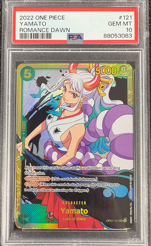 This PSA Gem Mint 10 Yamato Secret Rare from the 2022 One Piece Card Game: Romance Dawn set (OP01-121) is one of the most desirable cards from the game’s inaugural English release. Featuring a full-art alternate design, the card highlights Yamato from the Land of Wano arc with bold holographic artwork that has quickly become a fan favorite. As a Secret Rare (SEC) with a low pull rate, this card commands strong demand, driven by Yamato’s popularity and the significance of the Romance Dawn set.