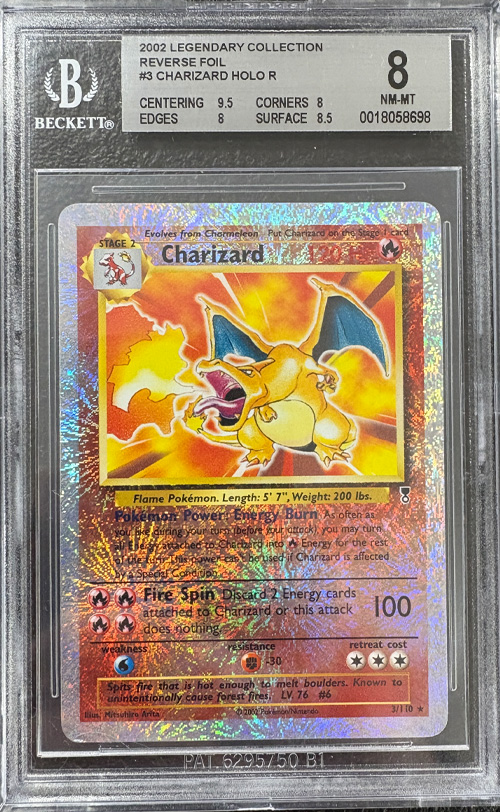 This Beckett BGS 8 (Near Mint–Mint) Charizard from the 2002 Pokémon Legendary Collection (Card #3) features the iconic Reverse Foil “Fireworks” holographic pattern exclusive to this set. As a Holo Rare reprint of one of the most recognizable Pokémon cards ever released, the Legendary Collection Charizard is especially prized for its limited print run and highly distinctive foil treatment. Graded NM-MT by Beckett, this card offers an excellent balance of condition and collectability, making it a standout example of vintage-era Charizard and a desirable addition to any serious Pokémon card collection.