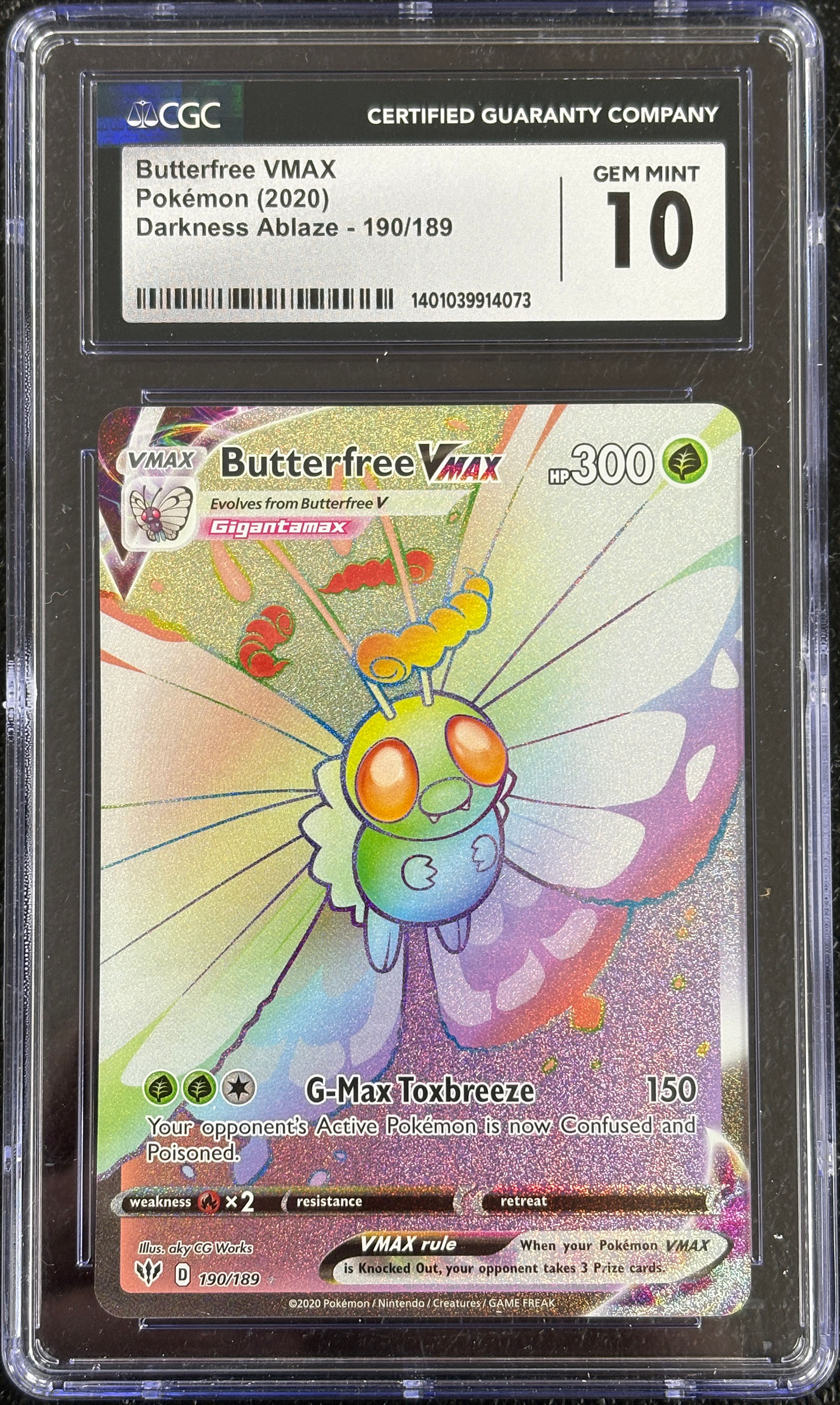 This Butterfree VMAX Rainbow Rare from Darkness Ablaze is a visually stunning Secret Rare featuring vibrant rainbow foil treatment and dynamic Gigantamax artwork. As card #190/189, it exceeds the standard set numbering, marking it as a true chase card. Graded CGC 10 Gem Mint, this copy represents the highest standard of condition, with flawless centering, surface, edges, and corners.